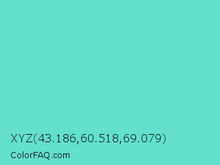 XYZ 43.186,60.518,69.079 Color is a light cyan color and the nearest color is Downy #6fd0c5. Hex code #63e0d0 and RGB value is rgb(99,224,208). In RGB color space, this color is composed of 39% red, 88% green, 82% blue, In CMYK color space, this color is composed of 56% cyan, 0% magenta, 7% yellow , 12% black , In HSL color space, this color has a hue angle of 172° , 67% saturation and 63% lightness.
