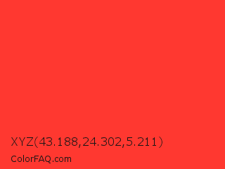XYZ 43.188,24.302,5.211 Color is a normal red color and the nearest color is Red Orange #ff3f34. Hex code #ff3830 and RGB value is rgb(255,56,48). In RGB color space, this color is composed of 100% red, 22% green, 19% blue, In CMYK color space, this color is composed of 0% cyan, 78% magenta, 81% yellow , 0% black , In HSL color space, this color has a hue angle of 2° , 100% saturation and 59% lightness.