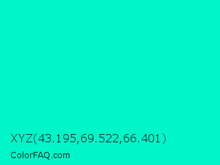 XYZ 43.195,69.522,66.401 Color is a normal cyan color and the nearest color is Bright Turquoise #08e8de. Hex code #00f5c9 and RGB value is rgb(0,245,201). In RGB color space, this color is composed of 0% red, 96% green, 79% blue, In CMYK color space, this color is composed of 100% cyan, 0% magenta, 18% yellow , 4% black , In HSL color space, this color has a hue angle of 169° , 100% saturation and 48% lightness.
