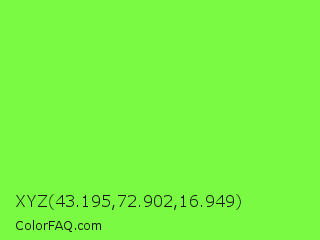 XYZ 43.195,72.902,16.949 Color is a light green color and the nearest color is Spring Frost #87ff2a. Hex code #7afa42 and RGB value is rgb(122,250,66). In RGB color space, this color is composed of 48% red, 98% green, 26% blue, In CMYK color space, this color is composed of 51% cyan, 0% magenta, 74% yellow , 2% black , In HSL color space, this color has a hue angle of 102° , 95% saturation and 62% lightness.