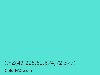 XYZ 43.226,61.674,72.577 Color is a light cyan color and the nearest color is Turquoise #40e0d0. Hex code #55e3d5 and RGB value is rgb(85,227,213). In RGB color space, this color is composed of 33% red, 89% green, 84% blue, In CMYK color space, this color is composed of 63% cyan, 0% magenta, 6% yellow , 11% black , In HSL color space, this color has a hue angle of 174° , 72% saturation and 61% lightness.