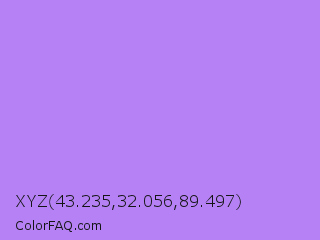 XYZ 43.235,32.056,89.497 Color is a light violet color and the nearest color is Lavender #b57edc. Hex code #b581f4 and RGB value is rgb(181,129,244). In RGB color space, this color is composed of 71% red, 51% green, 96% blue, In CMYK color space, this color is composed of 26% cyan, 47% magenta, 0% yellow , 4% black , In HSL color space, this color has a hue angle of 267° , 84% saturation and 73% lightness.