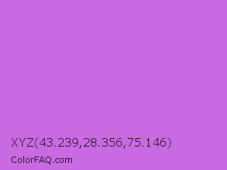 XYZ 43.239,28.356,75.146 Color is a light purple color and the nearest color is French Mauve #d473d4. Hex code #ca6ae2 and RGB value is rgb(202,106,226). In RGB color space, this color is composed of 79% red, 42% green, 89% blue, In CMYK color space, this color is composed of 11% cyan, 53% magenta, 0% yellow , 11% black , In HSL color space, this color has a hue angle of 288° , 67% saturation and 65% lightness.