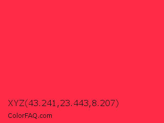 XYZ 43.241,23.443,8.207 Color is a normal red color and the nearest color is Red Salsa #fd3a4a. Hex code #ff2b47 and RGB value is rgb(255,43,71). In RGB color space, this color is composed of 100% red, 17% green, 28% blue, In CMYK color space, this color is composed of 0% cyan, 83% magenta, 72% yellow , 0% black , In HSL color space, this color has a hue angle of 352° , 100% saturation and 58% lightness.