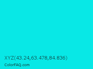 XYZ 43.24,63.478,84.836 Color is a normal cyan color and the nearest color is Bright Turquoise #08e8de. Hex code #08e8e6 and RGB value is rgb(8,232,230). In RGB color space, this color is composed of 3% red, 91% green, 90% blue, In CMYK color space, this color is composed of 97% cyan, 0% magenta, 1% yellow , 9% black , In HSL color space, this color has a hue angle of 179° , 93% saturation and 47% lightness.