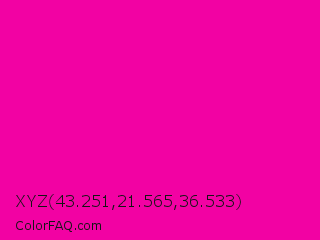 XYZ 43.251,21.565,36.533 Color is a normal magenta color and the nearest color is Hollywood Cerise #f400a1. Hex code #f202a3 and RGB value is rgb(242,2,163). In RGB color space, this color is composed of 95% red, 1% green, 64% blue, In CMYK color space, this color is composed of 0% cyan, 99% magenta, 33% yellow , 5% black , In HSL color space, this color has a hue angle of 320° , 98% saturation and 48% lightness.