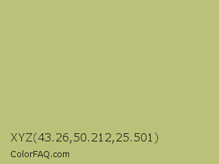 XYZ 43.26,50.212,25.501 Color is a light yellow color and the nearest color is Misty Moss #bbb477. Hex code #bcc179 and RGB value is rgb(188,193,121). In RGB color space, this color is composed of 74% red, 76% green, 47% blue, In CMYK color space, this color is composed of 3% cyan, 0% magenta, 37% yellow , 24% black , In HSL color space, this color has a hue angle of 64° , 37% saturation and 62% lightness.
