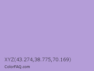 XYZ 43.274,38.775,70.169 Color is a light violet color and the nearest color is Light Pastel Purple #b19cd9. Hex code #b49dd8 and RGB value is rgb(180,157,216). In RGB color space, this color is composed of 71% red, 62% green, 85% blue, In CMYK color space, this color is composed of 17% cyan, 27% magenta, 0% yellow , 15% black , In HSL color space, this color has a hue angle of 263° , 43% saturation and 73% lightness.