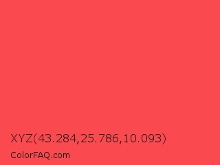 XYZ 43.284,25.786,10.093 Color is a light red color and the nearest color is Tart Orange #fb4d46. Hex code #fa4a4f and RGB value is rgb(250,74,79). In RGB color space, this color is composed of 98% red, 29% green, 31% blue, In CMYK color space, this color is composed of 0% cyan, 70% magenta, 68% yellow , 2% black , In HSL color space, this color has a hue angle of 358° , 95% saturation and 64% lightness.