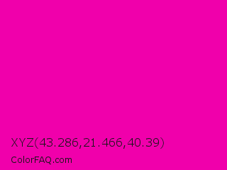 XYZ 43.286,21.466,40.39 Color is a normal magenta color and the nearest color is Hollywood Cerise #f400a1. Hex code #f000ab and RGB value is rgb(240,0,171). In RGB color space, this color is composed of 94% red, 0% green, 67% blue, In CMYK color space, this color is composed of 0% cyan, 100% magenta, 29% yellow , 6% black , In HSL color space, this color has a hue angle of 317° , 100% saturation and 47% lightness.