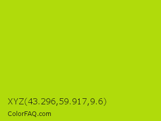 XYZ 43.296,59.917,9.6 Color is a normal lime color and the nearest color is Inch Worm #b0e313. Hex code #b0db0b and RGB value is rgb(176,219,11). In RGB color space, this color is composed of 69% red, 86% green, 4% blue, In CMYK color space, this color is composed of 20% cyan, 0% magenta, 95% yellow , 14% black , In HSL color space, this color has a hue angle of 72° , 90% saturation and 45% lightness.