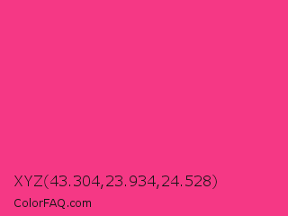 XYZ 43.304,23.934,24.528 Color is a normal rose color and the nearest color is Cerise Pink #ec3b83. Hex code #f53885 and RGB value is rgb(245,56,133). In RGB color space, this color is composed of 96% red, 22% green, 52% blue, In CMYK color space, this color is composed of 0% cyan, 77% magenta, 46% yellow , 4% black , In HSL color space, this color has a hue angle of 336° , 90% saturation and 59% lightness.