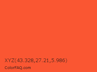 XYZ 43.328,27.21,5.986 Color is a normal red color and the nearest color is Portland Orange #ff5a36. Hex code #fa5632 and RGB value is rgb(250,86,50). In RGB color space, this color is composed of 98% red, 34% green, 20% blue, In CMYK color space, this color is composed of 0% cyan, 66% magenta, 80% yellow , 2% black , In HSL color space, this color has a hue angle of 11° , 95% saturation and 59% lightness.