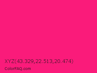 XYZ 43.329,22.513,20.474 Color is a normal rose color and the nearest color is Fluorescent Pink #ff1493. Hex code #fa1b7a and RGB value is rgb(250,27,122). In RGB color space, this color is composed of 98% red, 11% green, 48% blue, In CMYK color space, this color is composed of 0% cyan, 89% magenta, 51% yellow , 2% black , In HSL color space, this color has a hue angle of 334° , 96% saturation and 54% lightness.