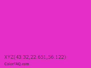 XYZ 43.32,22.651,56.122 Color is a normal magenta color and the nearest color is Steel Pink #cc33cc. Hex code #e42fc7 and RGB value is rgb(228,47,199). In RGB color space, this color is composed of 89% red, 18% green, 78% blue, In CMYK color space, this color is composed of 0% cyan, 79% magenta, 13% yellow , 11% black , In HSL color space, this color has a hue angle of 310° , 77% saturation and 54% lightness.