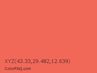 XYZ 43.33,29.482,12.639 Color is a light red color and the nearest color is Persimmon #ff6b53. Hex code #f26858 and RGB value is rgb(242,104,88). In RGB color space, this color is composed of 95% red, 41% green, 35% blue, In CMYK color space, this color is composed of 0% cyan, 57% magenta, 64% yellow , 5% black , In HSL color space, this color has a hue angle of 6° , 86% saturation and 65% lightness.