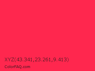 XYZ 43.341,23.261,9.413 Color is a normal red color and the nearest color is Awesome #ff2052. Hex code #ff274e and RGB value is rgb(255,39,78). In RGB color space, this color is composed of 100% red, 15% green, 31% blue, In CMYK color space, this color is composed of 0% cyan, 85% magenta, 69% yellow , 0% black , In HSL color space, this color has a hue angle of 349° , 100% saturation and 58% lightness.