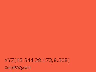 XYZ 43.344,28.173,8.308 Color is a light red color and the nearest color is Orange Soda #fa5b3d. Hex code #f75e42 and RGB value is rgb(247,94,66). In RGB color space, this color is composed of 97% red, 37% green, 26% blue, In CMYK color space, this color is composed of 0% cyan, 62% magenta, 73% yellow , 3% black , In HSL color space, this color has a hue angle of 9° , 92% saturation and 61% lightness.
