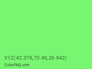 XYZ 43.379,70.49,26.942 Color is a light green color and the nearest color is Screamin Green #66ff66. Hex code #78f571 and RGB value is rgb(120,245,113). In RGB color space, this color is composed of 47% red, 96% green, 44% blue, In CMYK color space, this color is composed of 51% cyan, 0% magenta, 54% yellow , 4% black , In HSL color space, this color has a hue angle of 117° , 87% saturation and 70% lightness.