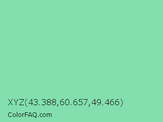 XYZ 43.388,60.657,49.466 Color is a light green color and the nearest color is Vista Blue #8fd6b4. Hex code #83dfae and RGB value is rgb(131,223,174). In RGB color space, this color is composed of 51% red, 87% green, 68% blue, In CMYK color space, this color is composed of 41% cyan, 0% magenta, 22% yellow , 13% black , In HSL color space, this color has a hue angle of 148° , 59% saturation and 69% lightness.