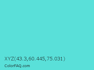 XYZ 43.3,60.445,75.031 Color is a light cyan color and the nearest color is Viking #64ccdb. Hex code #59e0d9 and RGB value is rgb(89,224,217). In RGB color space, this color is composed of 35% red, 88% green, 85% blue, In CMYK color space, this color is composed of 60% cyan, 0% magenta, 3% yellow , 12% black , In HSL color space, this color has a hue angle of 177° , 69% saturation and 61% lightness.