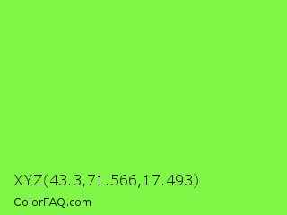 XYZ 43.3,71.566,17.493 Color is a light green color and the nearest color is Kiwi #8ee53f. Hex code #80f747 and RGB value is rgb(128,247,71). In RGB color space, this color is composed of 50% red, 97% green, 28% blue, In CMYK color space, this color is composed of 48% cyan, 0% magenta, 71% yellow , 3% black , In HSL color space, this color has a hue angle of 101° , 92% saturation and 62% lightness.