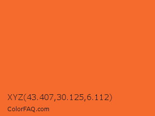XYZ 43.407,30.125,6.112 Color is a normal orange color and the nearest color is Deep Carrot Orange #e9692c. Hex code #f56b2e and RGB value is rgb(245,107,46). In RGB color space, this color is composed of 96% red, 42% green, 18% blue, In CMYK color space, this color is composed of 0% cyan, 56% magenta, 81% yellow , 4% black , In HSL color space, this color has a hue angle of 18° , 91% saturation and 57% lightness.