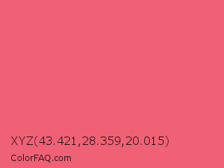 XYZ 43.421,28.359,20.015 Color is a light red color and the nearest color is Light Carmine Pink #e66771. Hex code #f06175 and RGB value is rgb(240,97,117). In RGB color space, this color is composed of 94% red, 38% green, 46% blue, In CMYK color space, this color is composed of 0% cyan, 60% magenta, 51% yellow , 6% black , In HSL color space, this color has a hue angle of 352° , 83% saturation and 66% lightness.