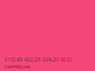 XYZ 43.422,25.324,21.012 Color is a light rose color and the nearest color is Sasquatch Socks #ff4681. Hex code #f5477a and RGB value is rgb(245,71,122). In RGB color space, this color is composed of 96% red, 28% green, 48% blue, In CMYK color space, this color is composed of 0% cyan, 71% magenta, 50% yellow , 4% black , In HSL color space, this color has a hue angle of 342° , 90% saturation and 62% lightness.