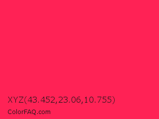 XYZ 43.452,23.06,10.755 Color is a normal red color and the nearest color is Awesome #ff2052. Hex code #ff2255 and RGB value is rgb(255,34,85). In RGB color space, this color is composed of 100% red, 13% green, 33% blue, In CMYK color space, this color is composed of 0% cyan, 87% magenta, 67% yellow , 0% black , In HSL color space, this color has a hue angle of 346° , 100% saturation and 57% lightness.