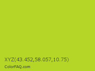 XYZ 43.452,58.057,10.75 Color is a normal lime color and the nearest color is Key Lime Pie #bfc921. Hex code #b5d626 and RGB value is rgb(181,214,38). In RGB color space, this color is composed of 71% red, 84% green, 15% blue, In CMYK color space, this color is composed of 15% cyan, 0% magenta, 82% yellow , 16% black , In HSL color space, this color has a hue angle of 71° , 70% saturation and 49% lightness.