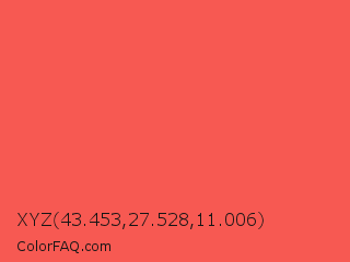 XYZ 43.453,27.528,11.006 Color is a light red color and the nearest color is Sunset Orange #fd5e53. Hex code #f75952 and RGB value is rgb(247,89,82). In RGB color space, this color is composed of 97% red, 35% green, 32% blue, In CMYK color space, this color is composed of 0% cyan, 64% magenta, 67% yellow , 3% black , In HSL color space, this color has a hue angle of 3° , 91% saturation and 65% lightness.