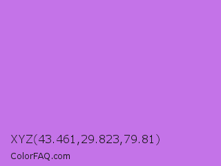 XYZ 43.461,29.823,79.81 Color is a light purple color and the nearest color is Lavender #b57edc. Hex code #c473e8 and RGB value is rgb(196,115,232). In RGB color space, this color is composed of 77% red, 45% green, 91% blue, In CMYK color space, this color is composed of 16% cyan, 50% magenta, 0% yellow , 9% black , In HSL color space, this color has a hue angle of 282° , 72% saturation and 68% lightness.