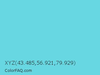 XYZ 43.485,56.921,79.929 Color is a light cyan color and the nearest color is Turquoise Blue #6cdae7. Hex code #67d7e1 and RGB value is rgb(103,215,225). In RGB color space, this color is composed of 40% red, 84% green, 88% blue, In CMYK color space, this color is composed of 54% cyan, 4% magenta, 0% yellow , 12% black , In HSL color space, this color has a hue angle of 185° , 67% saturation and 64% lightness.
