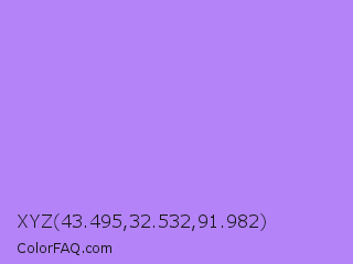 XYZ 43.495,32.532,91.982 Color is a light violet color and the nearest color is Lavender #b57edc. Hex code #b383f7 and RGB value is rgb(179,131,247). In RGB color space, this color is composed of 70% red, 51% green, 97% blue, In CMYK color space, this color is composed of 28% cyan, 47% magenta, 0% yellow , 3% black , In HSL color space, this color has a hue angle of 265° , 88% saturation and 74% lightness.