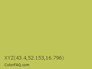 XYZ 43.4,52.153,16.796 Color is a normal yellow color and the nearest color is Celery #b8c25d. Hex code #bfc657 and RGB value is rgb(191,198,87). In RGB color space, this color is composed of 75% red, 78% green, 34% blue, In CMYK color space, this color is composed of 4% cyan, 0% magenta, 56% yellow , 22% black , In HSL color space, this color has a hue angle of 64° , 49% saturation and 56% lightness.