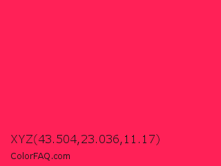 XYZ 43.504,23.036,11.17 Color is a normal red color and the nearest color is Awesome #ff2052. Hex code #ff2157 and RGB value is rgb(255,33,87). In RGB color space, this color is composed of 100% red, 13% green, 34% blue, In CMYK color space, this color is composed of 0% cyan, 87% magenta, 66% yellow , 0% black , In HSL color space, this color has a hue angle of 345° , 100% saturation and 56% lightness.