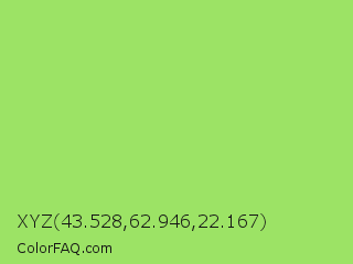 XYZ 43.528,62.946,22.167 Color is a light green color and the nearest color is Inchworm #b2ec5d. Hex code #9ce365 and RGB value is rgb(156,227,101). In RGB color space, this color is composed of 61% red, 89% green, 40% blue, In CMYK color space, this color is composed of 31% cyan, 0% magenta, 56% yellow , 11% black , In HSL color space, this color has a hue angle of 94° , 69% saturation and 64% lightness.