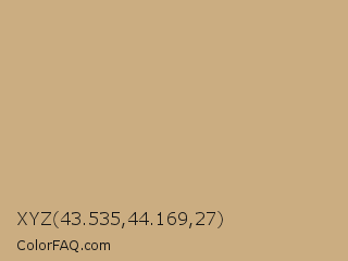 XYZ 43.535,44.169,27 Color is a light orange color and the nearest color is Light French Beige #c8ad7f. Hex code #cbad81 and RGB value is rgb(203,173,129). In RGB color space, this color is composed of 80% red, 68% green, 51% blue, In CMYK color space, this color is composed of 0% cyan, 15% magenta, 36% yellow , 20% black , In HSL color space, this color has a hue angle of 36° , 42% saturation and 65% lightness.