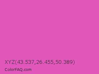 XYZ 43.537,26.455,50.389 Color is a light magenta color and the nearest color is Brilliant Rose #f653a6. Hex code #e157bc and RGB value is rgb(225,87,188). In RGB color space, this color is composed of 88% red, 34% green, 74% blue, In CMYK color space, this color is composed of 0% cyan, 61% magenta, 16% yellow , 12% black , In HSL color space, this color has a hue angle of 316° , 70% saturation and 61% lightness.