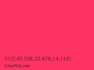 XYZ 43.538,23.878,14.119 Color is a normal red color and the nearest color is Radical Red #ff355e. Hex code #fc3263 and RGB value is rgb(252,50,99). In RGB color space, this color is composed of 99% red, 20% green, 39% blue, In CMYK color space, this color is composed of 0% cyan, 80% magenta, 61% yellow , 1% black , In HSL color space, this color has a hue angle of 345° , 97% saturation and 59% lightness.