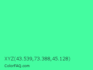 XYZ 43.539,73.388,45.128 Color is a light green color and the nearest color is Eucalyptus #44d7a8. Hex code #44fca0 and RGB value is rgb(68,252,160). In RGB color space, this color is composed of 27% red, 99% green, 63% blue, In CMYK color space, this color is composed of 73% cyan, 0% magenta, 37% yellow , 1% black , In HSL color space, this color has a hue angle of 150° , 97% saturation and 63% lightness.
