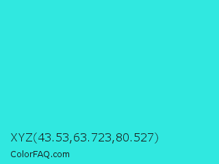 XYZ 43.53,63.723,80.527 Color is a normal cyan color and the nearest color is Turquoise #40e0d0. Hex code #30e8e0 and RGB value is rgb(48,232,224). In RGB color space, this color is composed of 19% red, 91% green, 88% blue, In CMYK color space, this color is composed of 79% cyan, 0% magenta, 3% yellow , 9% black , In HSL color space, this color has a hue angle of 177° , 80% saturation and 55% lightness.