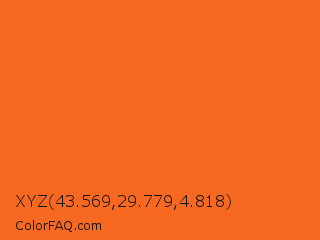 XYZ 43.569,29.779,4.818 Color is a normal orange color and the nearest color is Orange #ff681f. Hex code #f76820 and RGB value is rgb(247,104,32). In RGB color space, this color is composed of 97% red, 41% green, 13% blue, In CMYK color space, this color is composed of 0% cyan, 58% magenta, 87% yellow , 3% black , In HSL color space, this color has a hue angle of 20° , 93% saturation and 55% lightness.