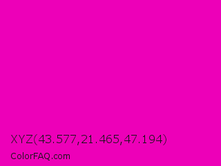 XYZ 43.577,21.465,47.194 Color is a normal magenta color and the nearest color is Shocking Pink #fc0fc0. Hex code #ed00b8 and RGB value is rgb(237,0,184). In RGB color space, this color is composed of 93% red, 0% green, 72% blue, In CMYK color space, this color is composed of 0% cyan, 100% magenta, 22% yellow , 7% black , In HSL color space, this color has a hue angle of 313° , 100% saturation and 46% lightness.