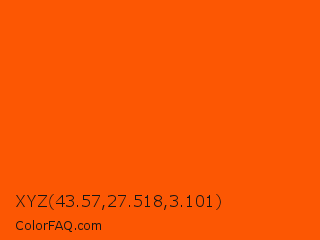 XYZ 43.57,27.518,3.101 Color is a normal orange color and the nearest color is Willpower Orange #fd5800. Hex code #fc5703 and RGB value is rgb(252,87,3). In RGB color space, this color is composed of 99% red, 34% green, 1% blue, In CMYK color space, this color is composed of 0% cyan, 65% magenta, 99% yellow , 1% black , In HSL color space, this color has a hue angle of 20° , 98% saturation and 50% lightness.