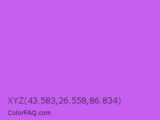 XYZ 43.583,26.558,86.834 Color is a light purple color and the nearest color is Heliotrope #df73ff. Hex code #c75ef2 and RGB value is rgb(199,94,242). In RGB color space, this color is composed of 78% red, 37% green, 95% blue, In CMYK color space, this color is composed of 18% cyan, 61% magenta, 0% yellow , 5% black , In HSL color space, this color has a hue angle of 283° , 85% saturation and 66% lightness.