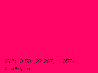 XYZ 43.584,22.267,14.057 Color is a normal rose color and the nearest color is Vivid Raspberry #ff006c. Hex code #ff0464 and RGB value is rgb(255,4,100). In RGB color space, this color is composed of 100% red, 2% green, 39% blue, In CMYK color space, this color is composed of 0% cyan, 98% magenta, 61% yellow , 0% black , In HSL color space, this color has a hue angle of 337° , 100% saturation and 51% lightness.
