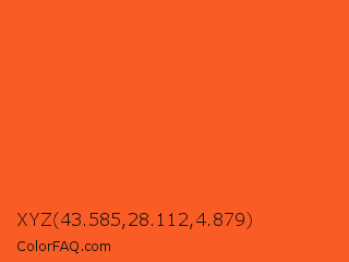 XYZ 43.585,28.112,4.879 Color is a normal color and the nearest color is Giants Orange #fe5a1d. Hex code #fa5c25 and RGB value is rgb(250,92,37). In RGB color space, this color is composed of 98% red, 36% green, 15% blue, In CMYK color space, this color is composed of 0% cyan, 63% magenta, 85% yellow , 2% black , In HSL color space, this color has a hue angle of 15° , 96% saturation and 56% lightness.