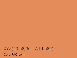 XYZ 43.58,36.17,14.582 Color is a light orange color and the nearest color is Big Foot Feet #e88e5a. Hex code #e58c5b and RGB value is rgb(229,140,91). In RGB color space, this color is composed of 90% red, 55% green, 36% blue, In CMYK color space, this color is composed of 0% cyan, 39% magenta, 60% yellow , 10% black , In HSL color space, this color has a hue angle of 21° , 73% saturation and 63% lightness.